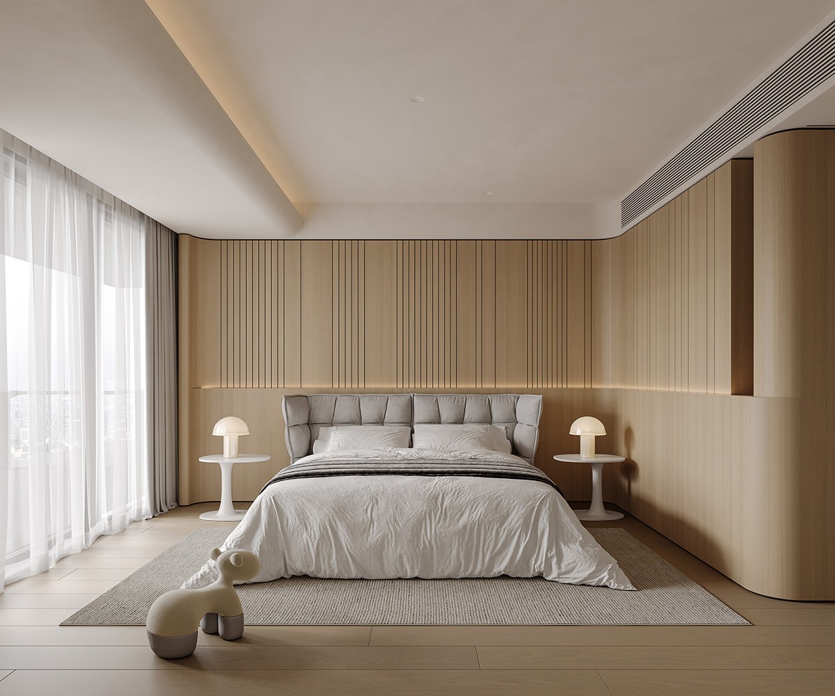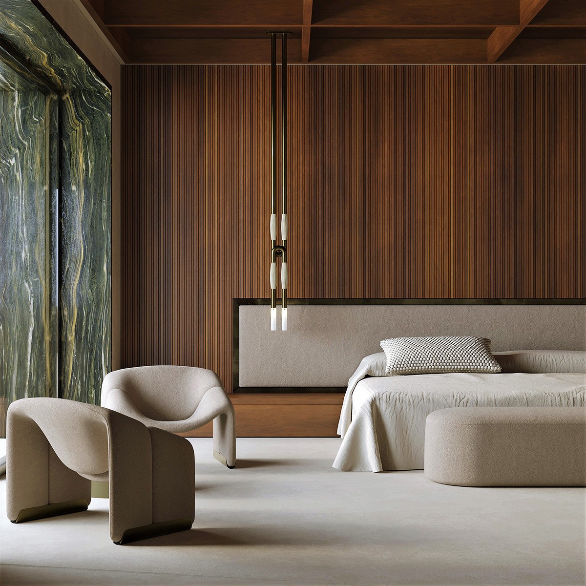 Deeply fluted wood panels make an attention-grabbing statement wall with a soothing air.