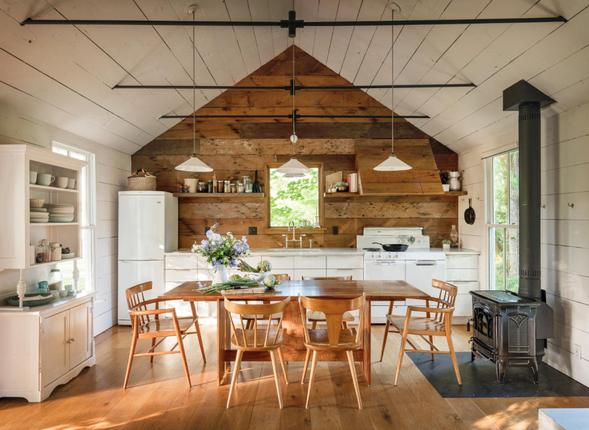 Build a kitchen wood accent wall with reclaimed wood to conjure a charming farmhouse ambiance.