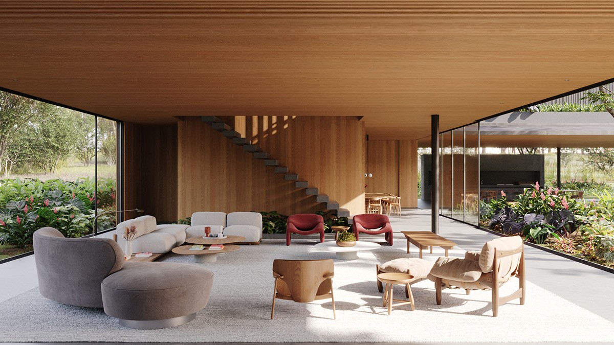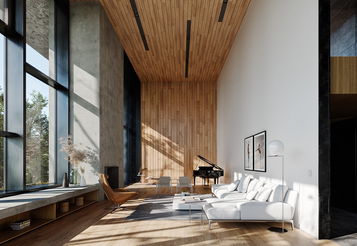 Stretch a vertically wood-planked wall up and across the ceiling to make a striking wraparound effect. This approach works particularly well in lofty double-height living spaces.