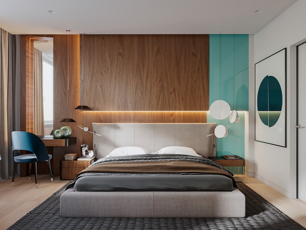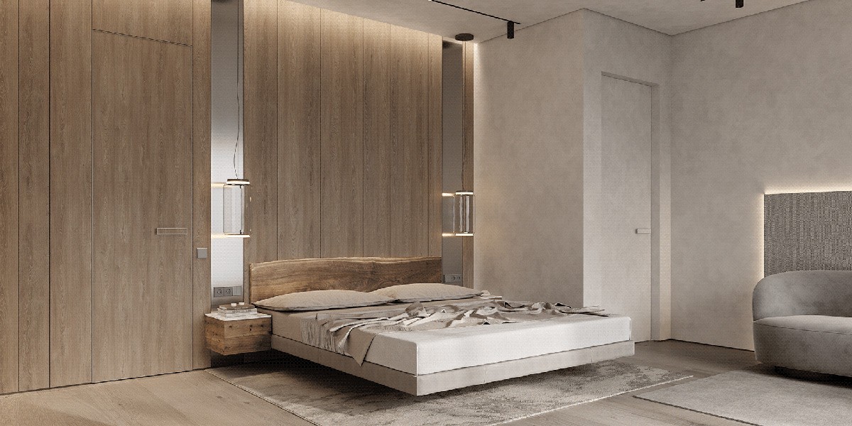 Cut a geometric pattern for your headboard wall. Float matching wooden nightstands across it and choose a coordinating wooden bedstead.