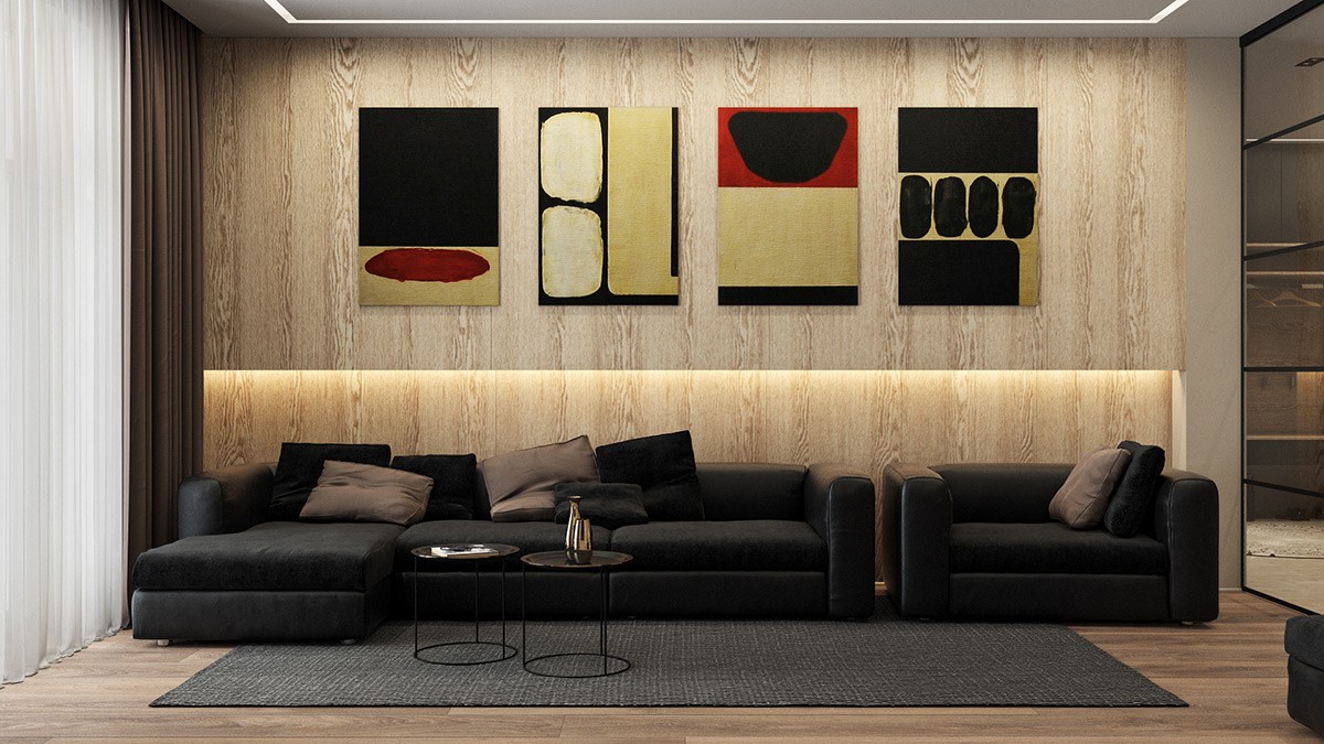 Combine a wood-paneled wall with a piece of 3D wall decor or a unique wall shelf, like this sculptural geometric bookcase. Situating a textured background beneath a flamboyant form achieves a high-end, layered look.