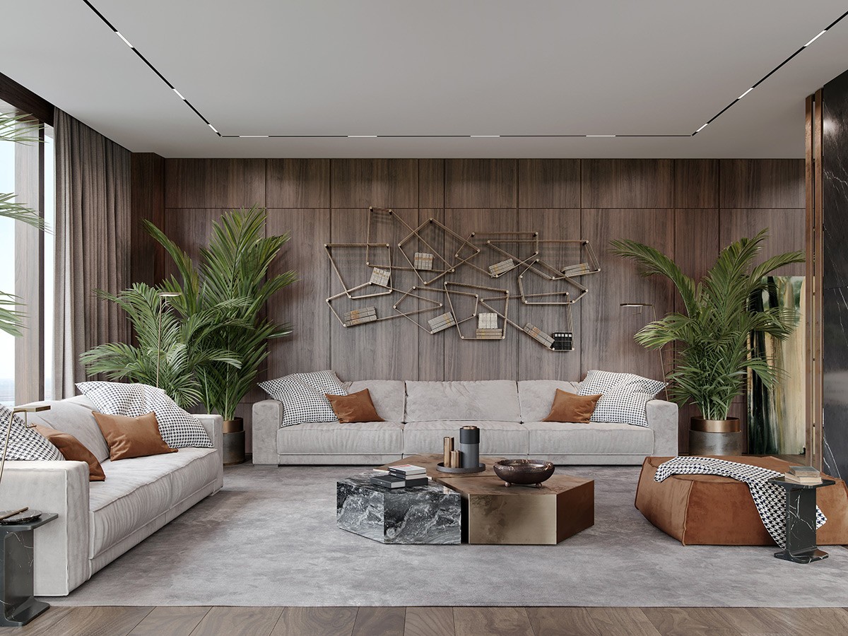 Rotating wooden fins divide this living room from its neighboring space. The wall of wood delivers a rich depth of color to the neutral scheme and complements a pale, travertine focal wall.