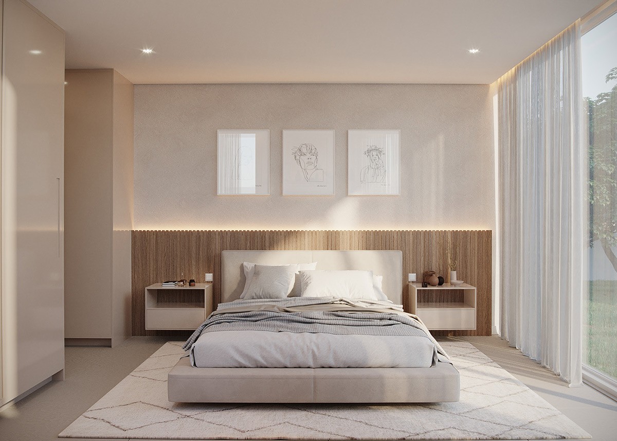 Build an extended headboard in wood to fill the entire width of your bedroom. Wrap the wooden construction around the corners of the room to increase its cozy factor.