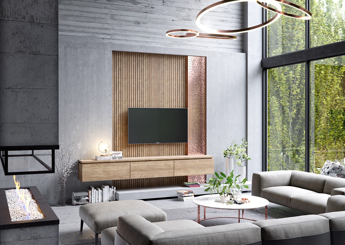 Wood slats work well as sturdy TV wall decor. Their natural tone warmly deflects attention away from the vacant black screen. Here, wood slats are laid alongside a copper column, fashioning an extraordinary feature with wonderful luster.